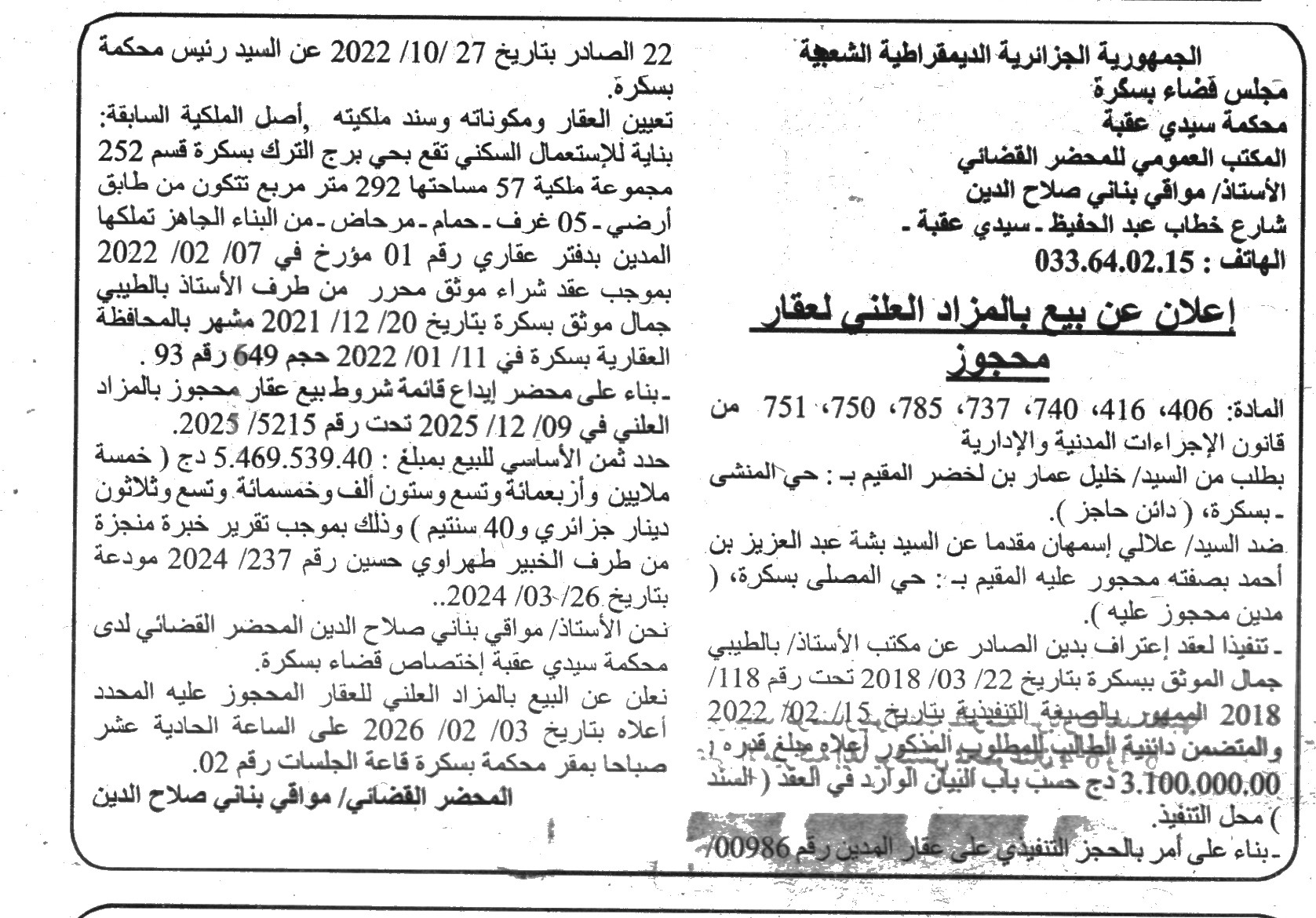 Il sera procédé à la vente au plus offrant et dernier enchérisseur le :