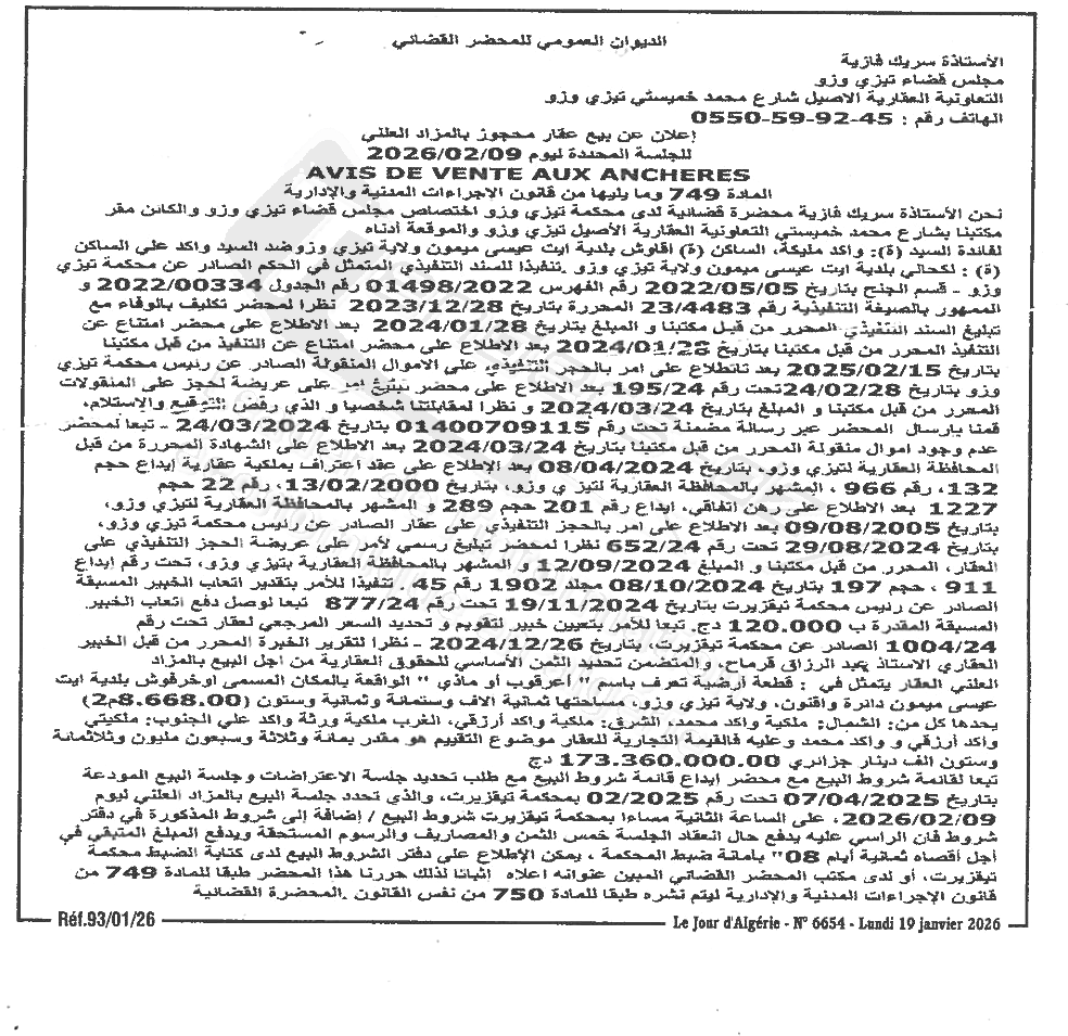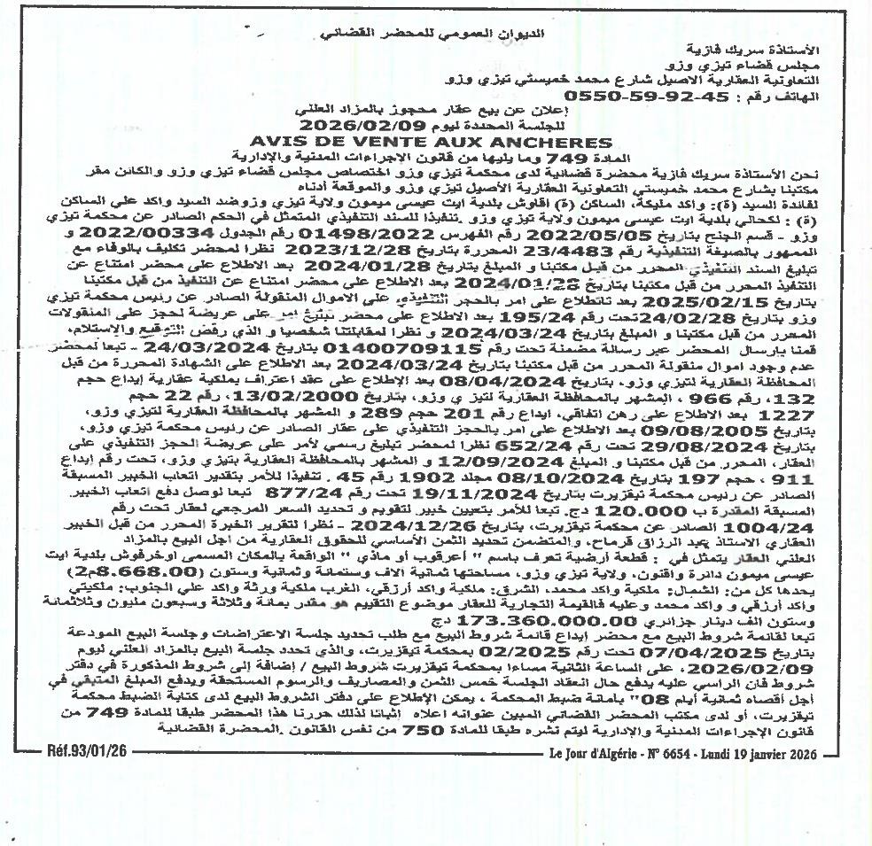 Il sera procédé à la vente au plus offrant et dernier enchérisseur le :