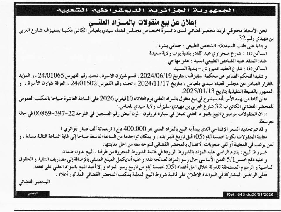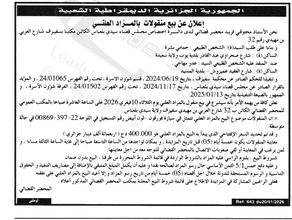 Il sera procédé à la vente au plus offrant et dernier enchérisseur le :