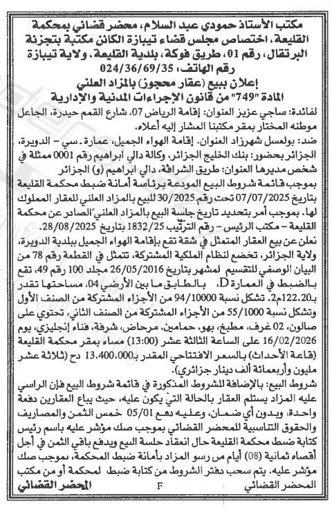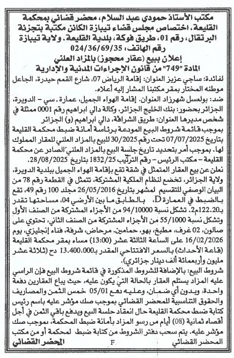 Il sera procédé à la vente au plus offrant et dernier enchérisseur le :