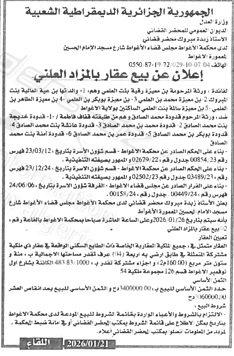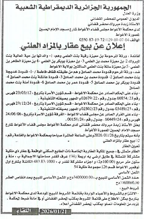 Il sera procédé à la vente au plus offrant et dernier enchérisseur le : 26/01/2026';