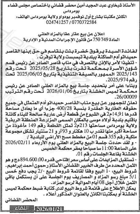 Il sera procédé à la vente au plus offrant et dernier enchérisseur le : 28/01/2026';