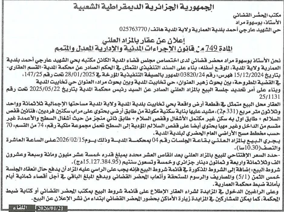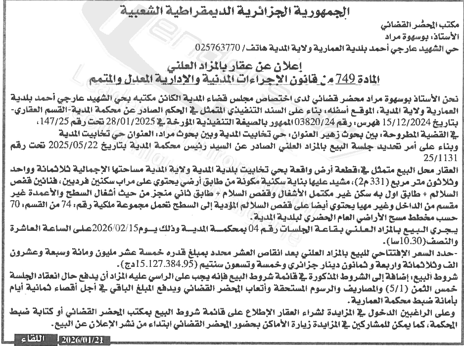 Il sera procédé à la vente au plus offrant et dernier enchérisseur le : 28/01/2026';