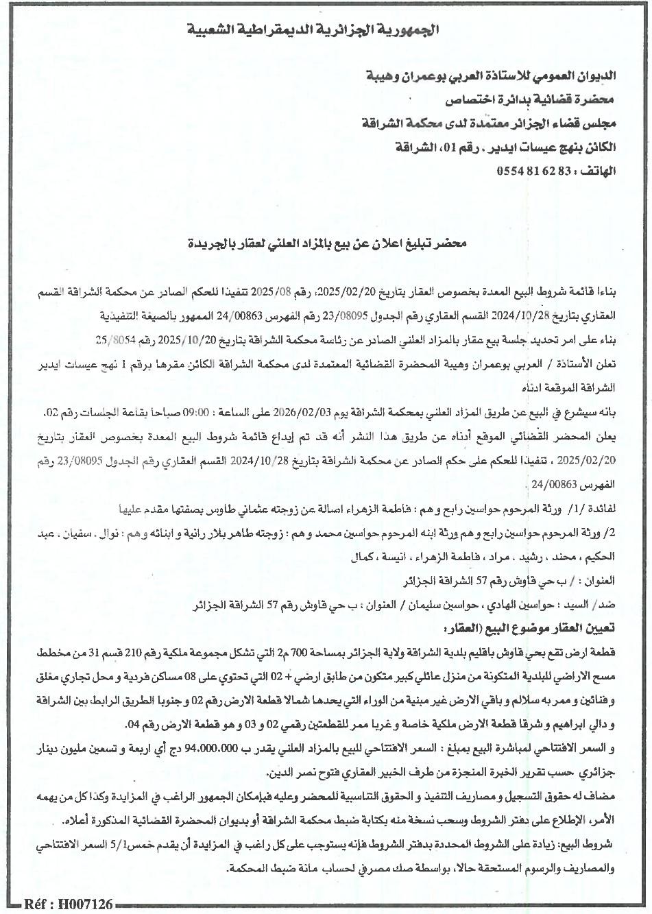 Il sera procédé à la vente au plus offrant et dernier enchérisseur le :