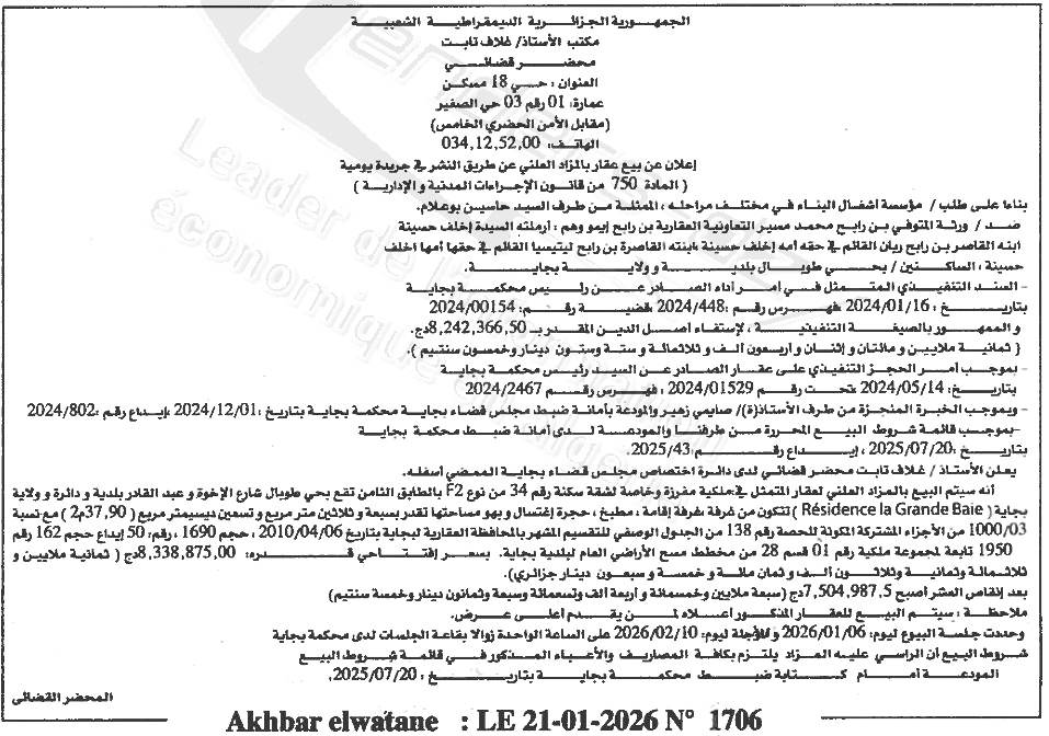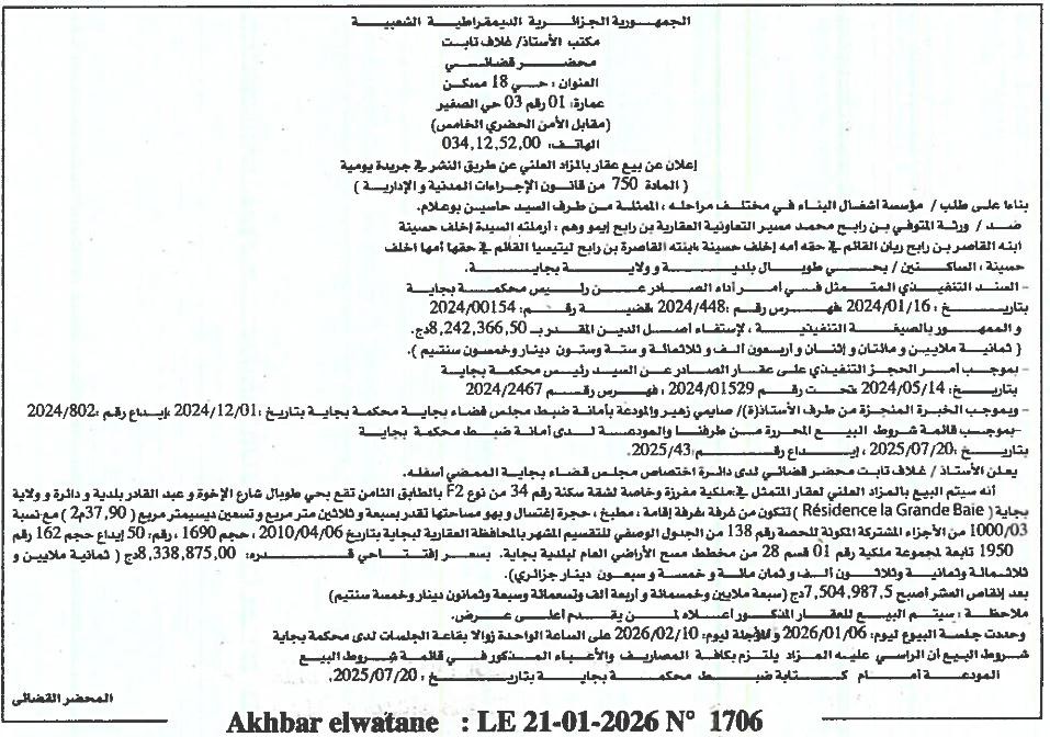 Il sera procédé à la vente au plus offrant et dernier enchérisseur le :