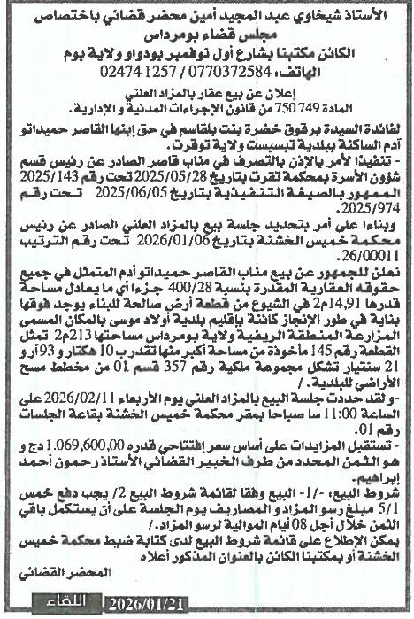 Il sera procédé à la vente au plus offrant et dernier enchérisseur le : 11/02/2026';