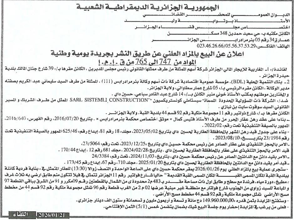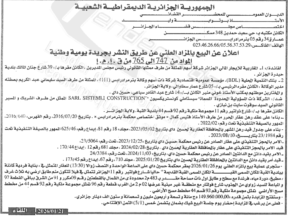 Il sera procédé à la vente au plus offrant et dernier enchérisseur le :