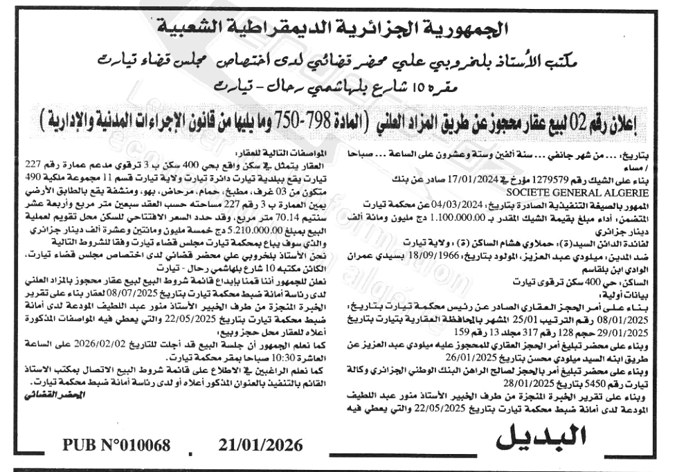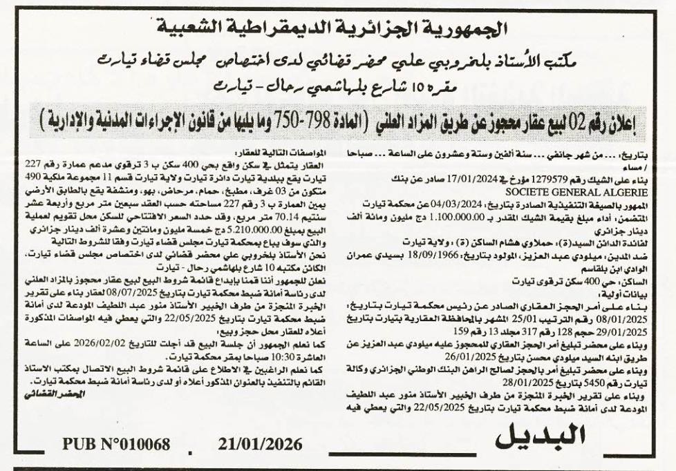 Il sera procédé à la vente au plus offrant et dernier enchérisseur le : 02/02/2026';