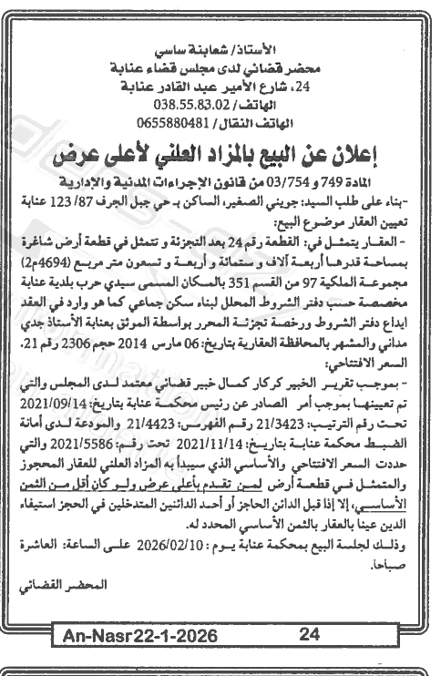 Il sera procédé à la vente au plus offrant et dernier enchérisseur le : 29/01/2026';