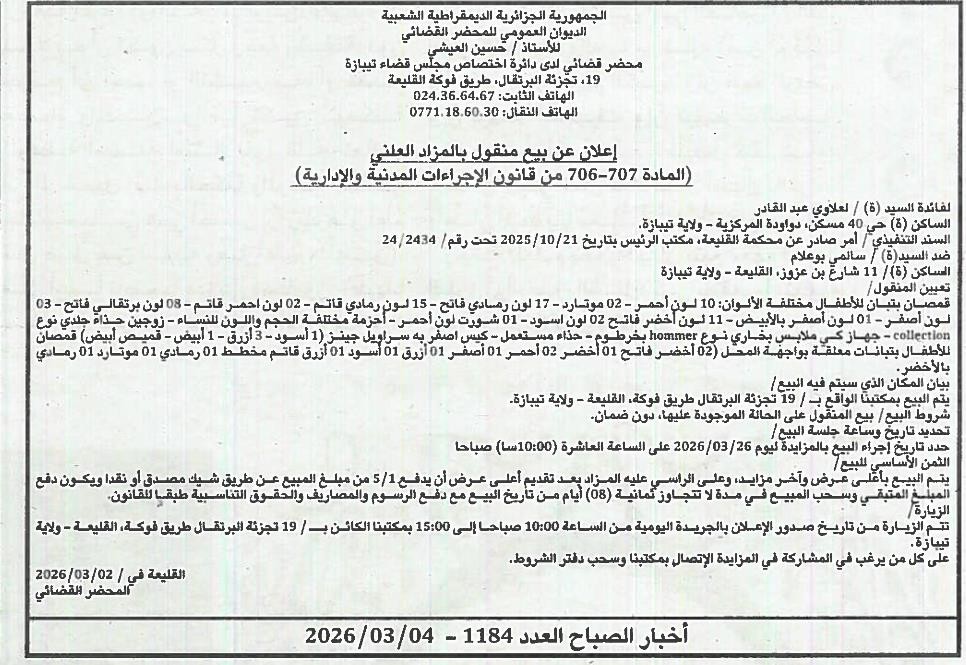 Il sera procédé à la vente au plus offrant et dernier enchérisseur le :