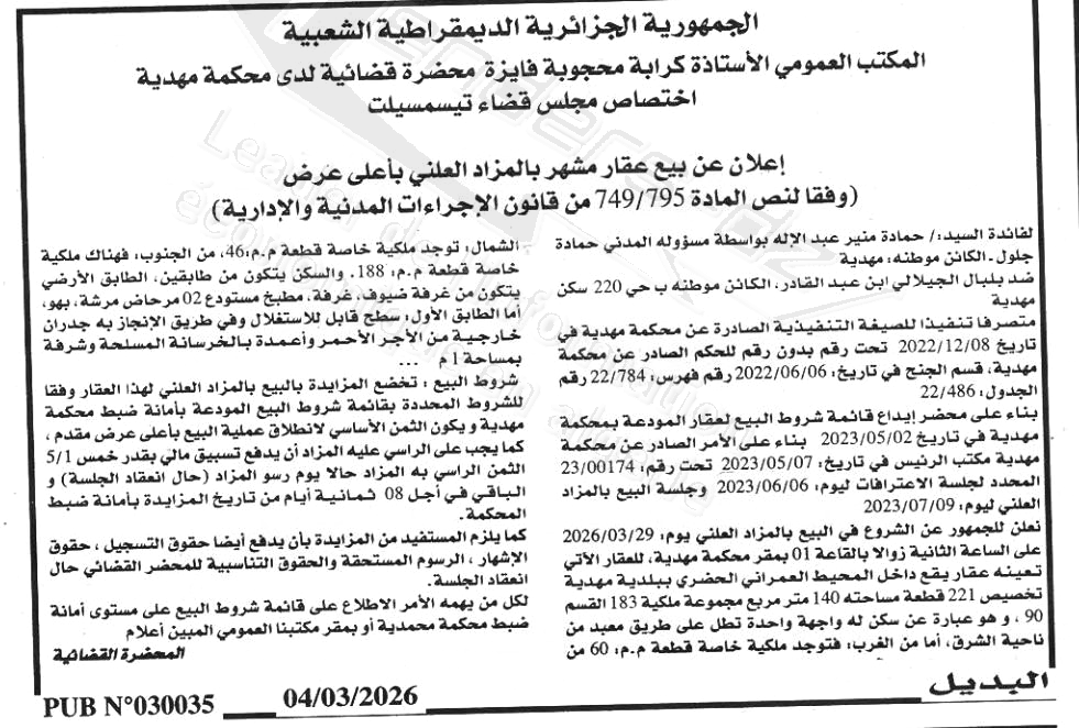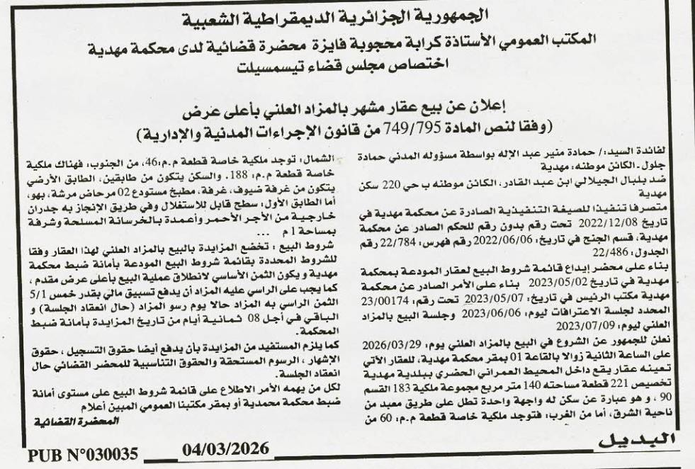 Il sera procédé à la vente au plus offrant et dernier enchérisseur le :