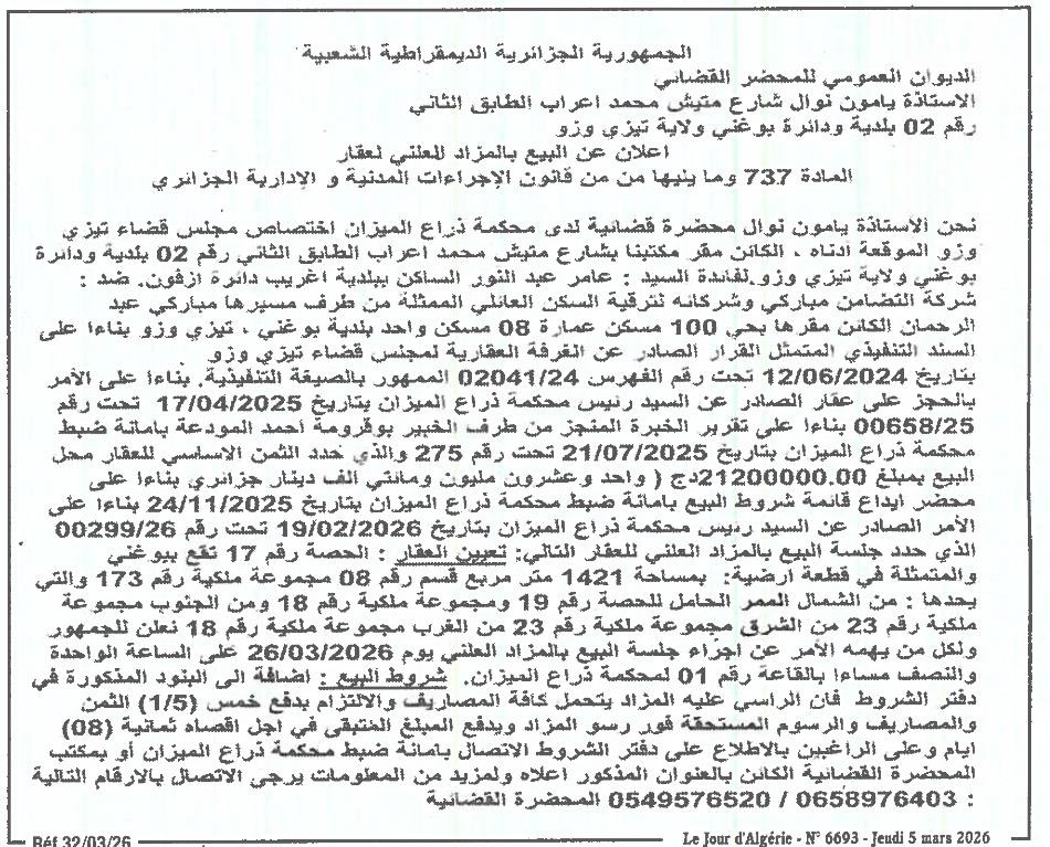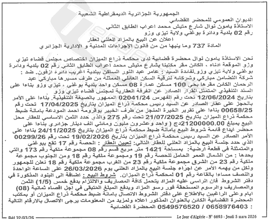 Il sera procédé à la vente au plus offrant et dernier enchérisseur le :