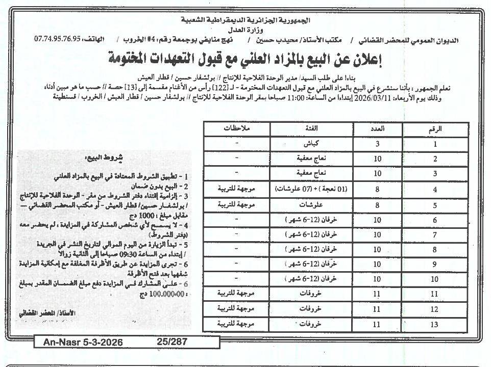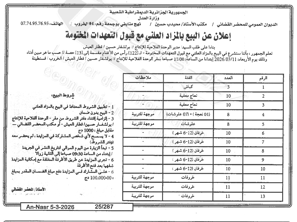 | Objet: Vente 122 têtes de moutons réparties en 13 parts. | |