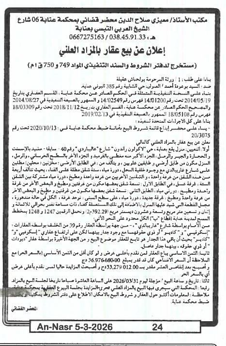 Il sera procédé à la vente au plus offrant et dernier enchérisseur le :