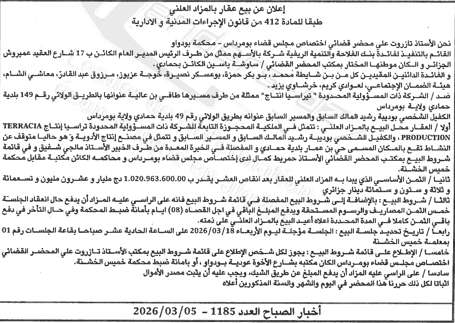 | Objet: Propriété saisie appartenant à la société à responsabilité limitée Terracia Production TERRACIA. | |
