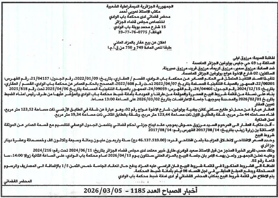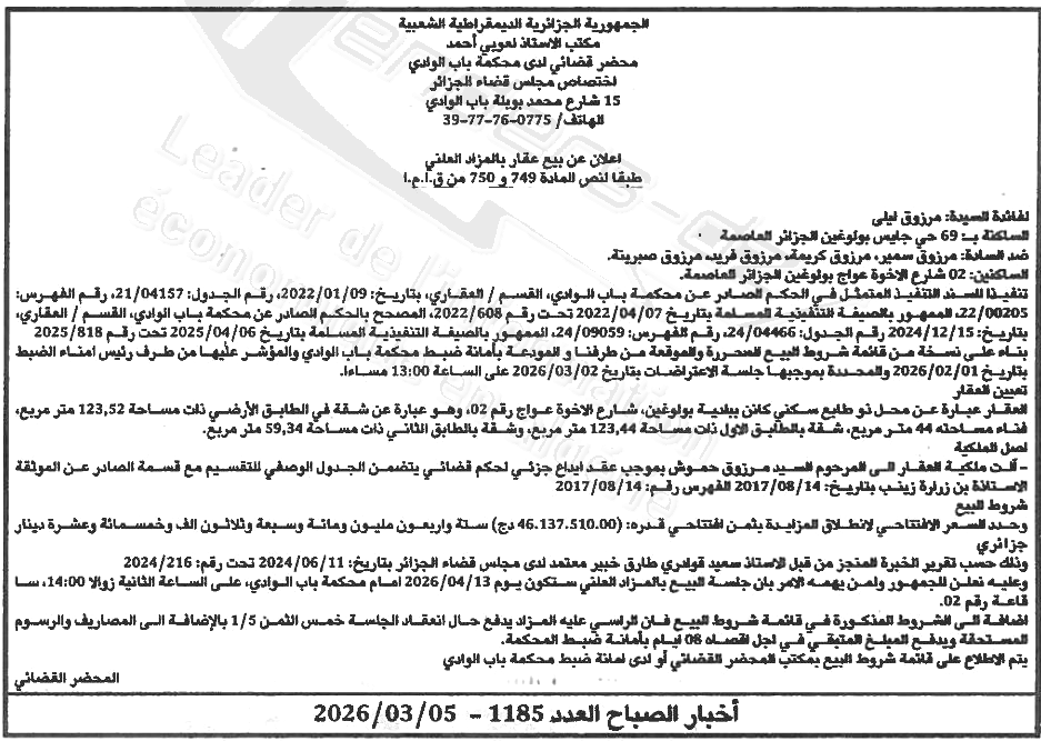 Il sera procédé à la vente au plus offrant et dernier enchérisseur le :