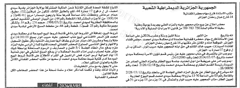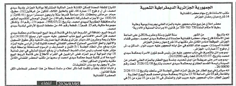 Il sera procédé à la vente au plus offrant et dernier enchérisseur le :