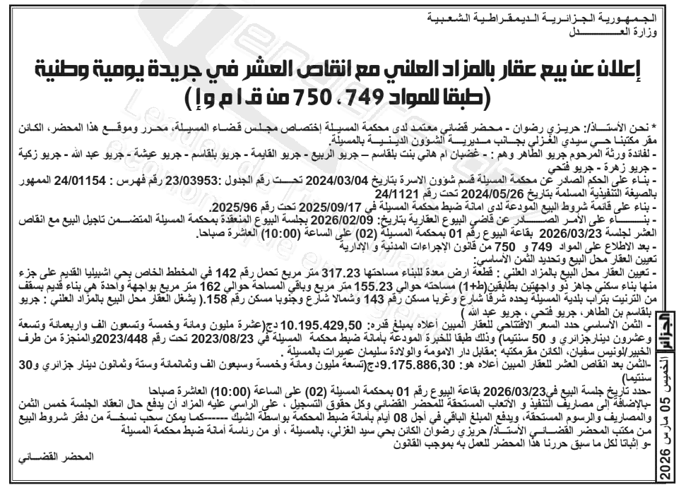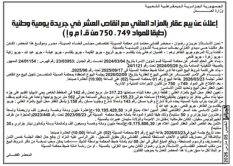 Il sera procédé à la vente au plus offrant et dernier enchérisseur le :