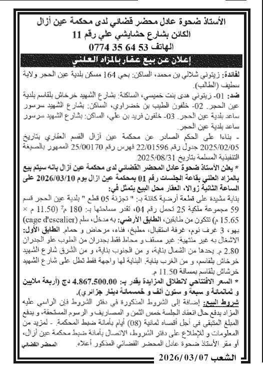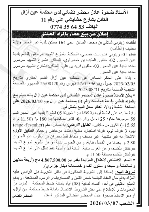 Il sera procédé à la vente au plus offrant et dernier enchérisseur le :