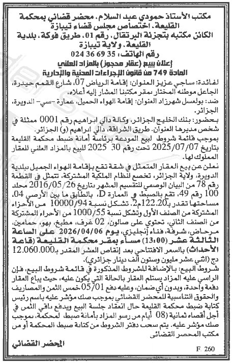 Il sera procédé à la vente au plus offrant et dernier enchérisseur le :