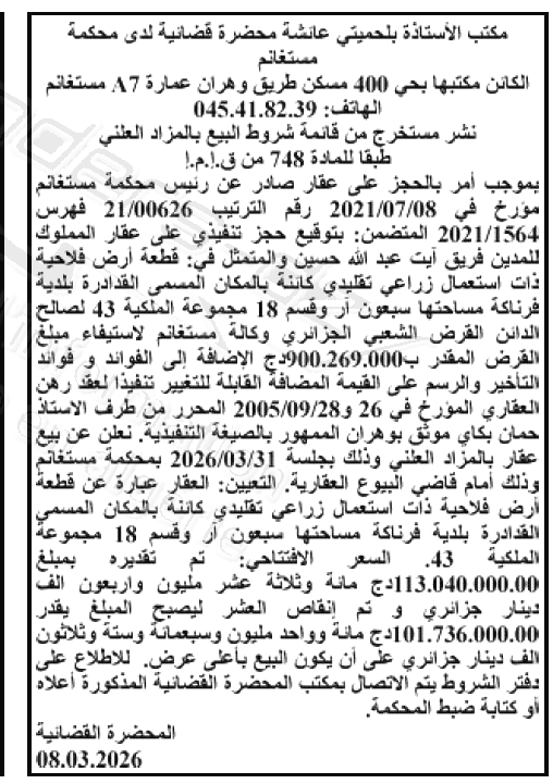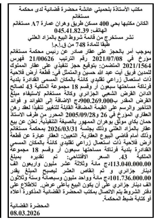 Il sera procédé à la vente au plus offrant et dernier enchérisseur le : 31/03/2026';
