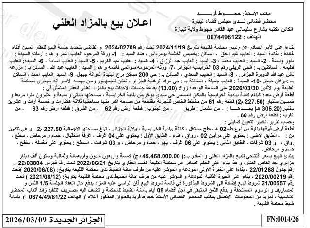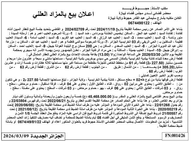 Il sera procédé à la vente au plus offrant et dernier enchérisseur le :