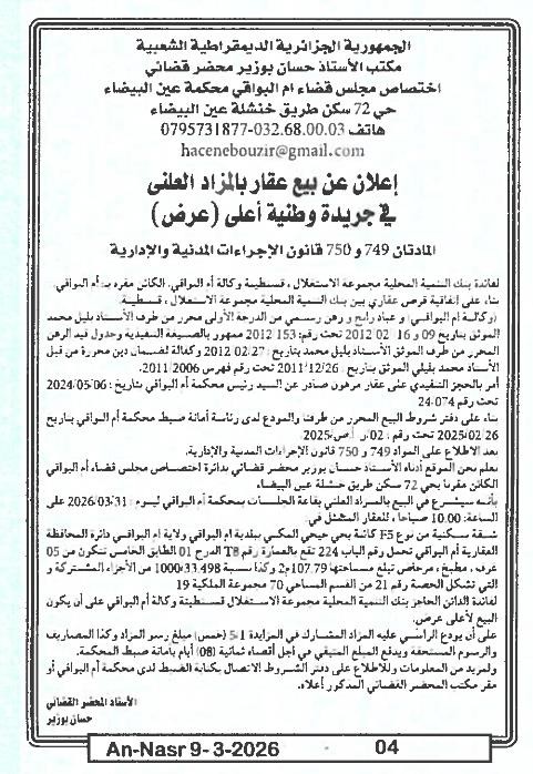 Il sera procédé à la vente au plus offrant et dernier enchérisseur le :