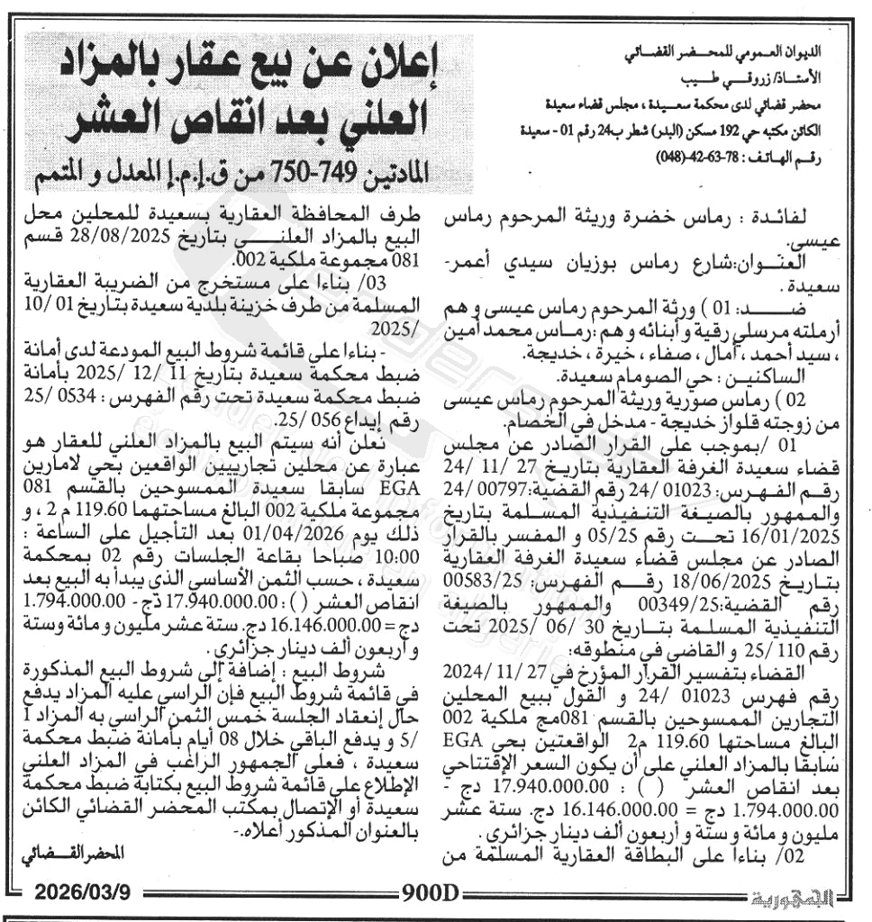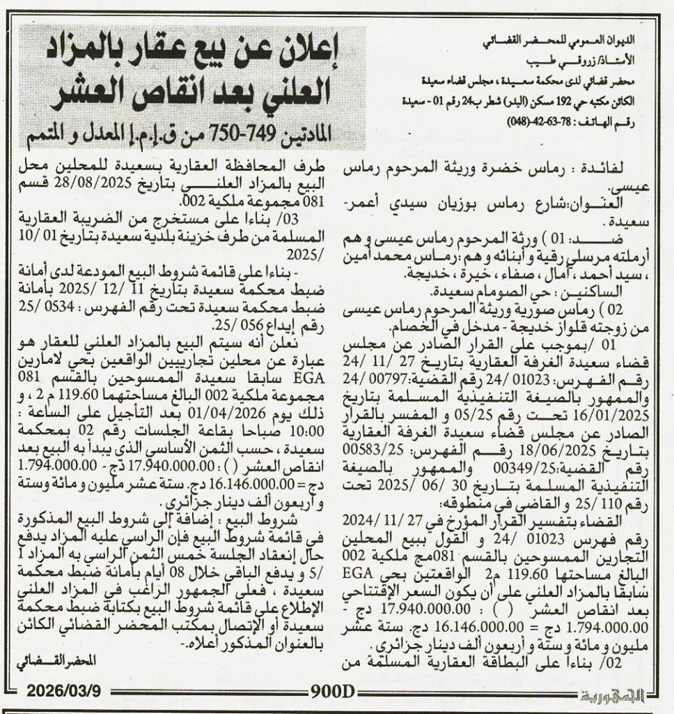 Il sera procédé à la vente au plus offrant et dernier enchérisseur le :