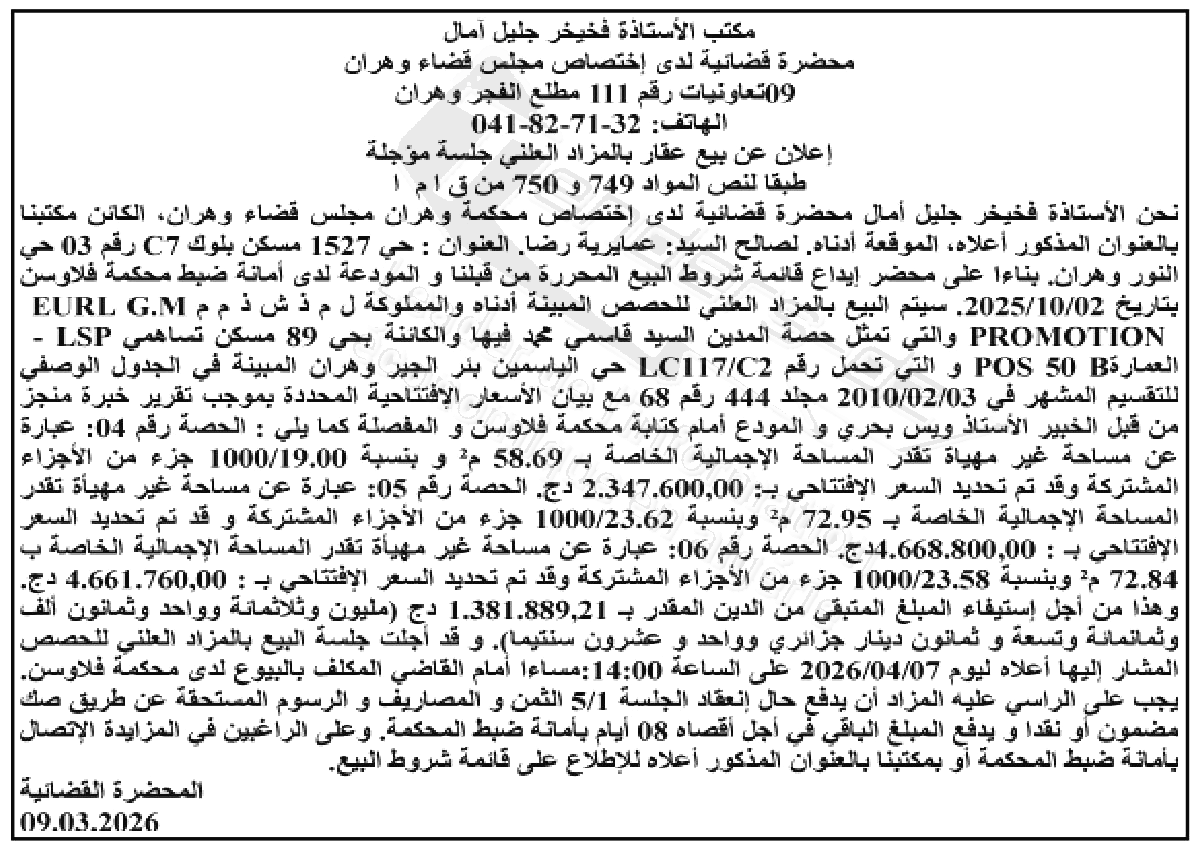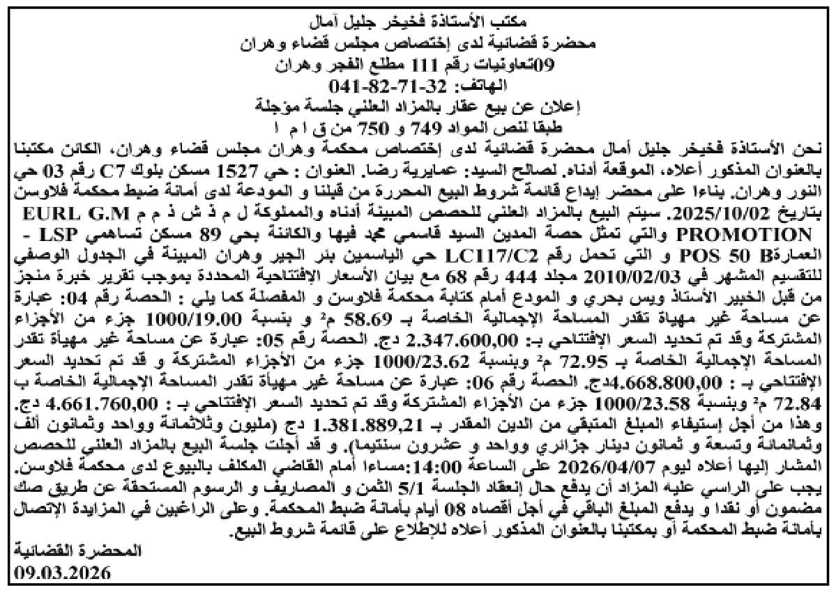 Il sera procédé à la vente au plus offrant et dernier enchérisseur le :