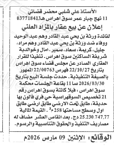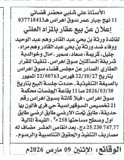 Il sera procédé à la vente au plus offrant et dernier enchérisseur le : 16/03/2026