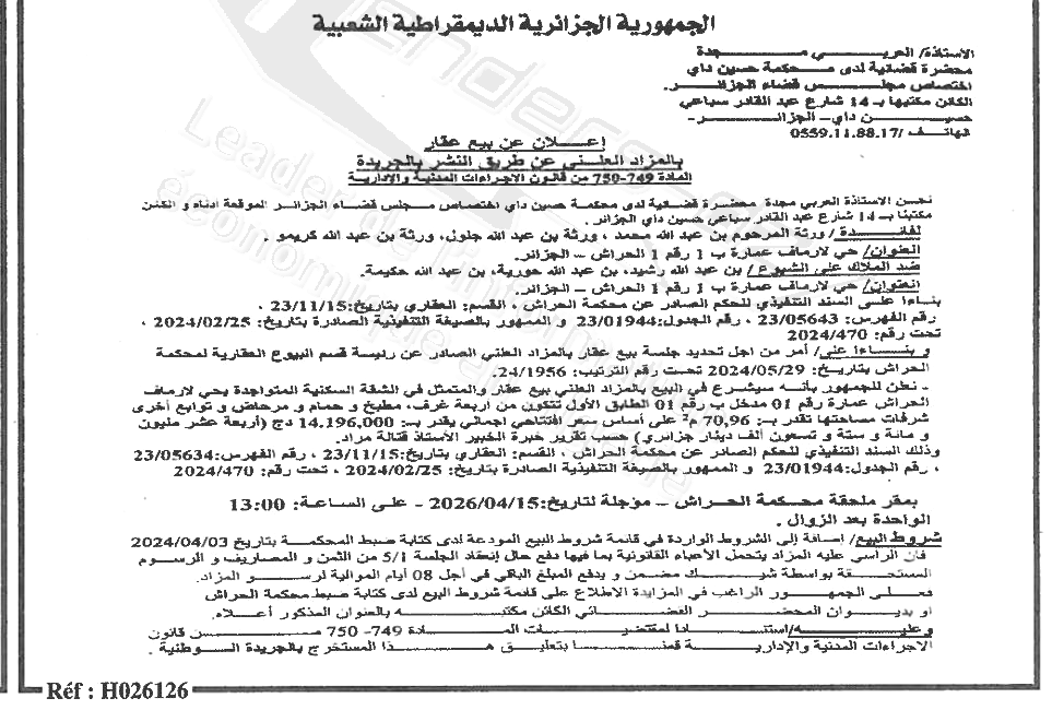 Il sera procédé à la vente au plus offrant et dernier enchérisseur le :