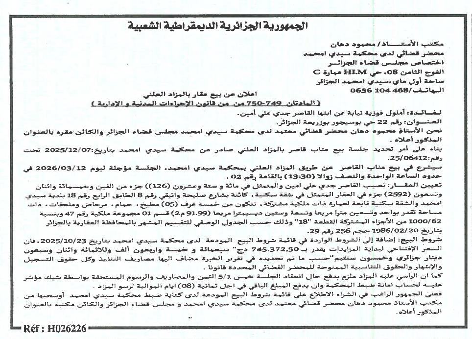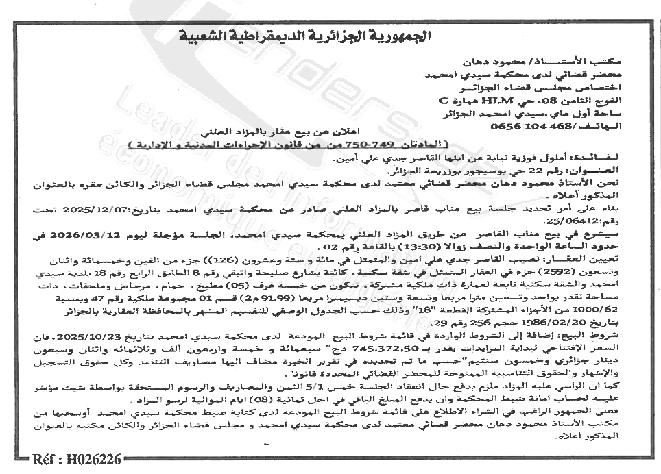 Il sera procédé à la vente au plus offrant et dernier enchérisseur le : 17/03/2026';