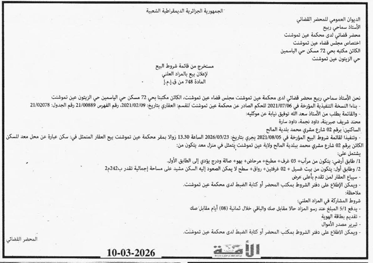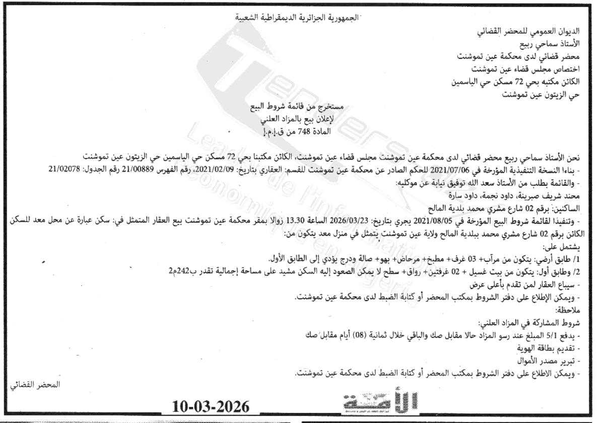 Il sera procédé à la vente au plus offrant et dernier enchérisseur le :