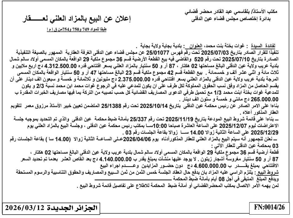 Il sera procédé à la vente au plus offrant et dernier enchérisseur le : 06/04/2026';
