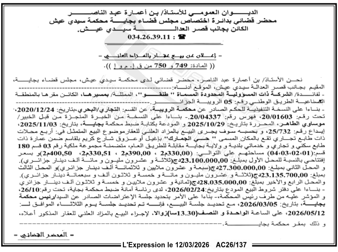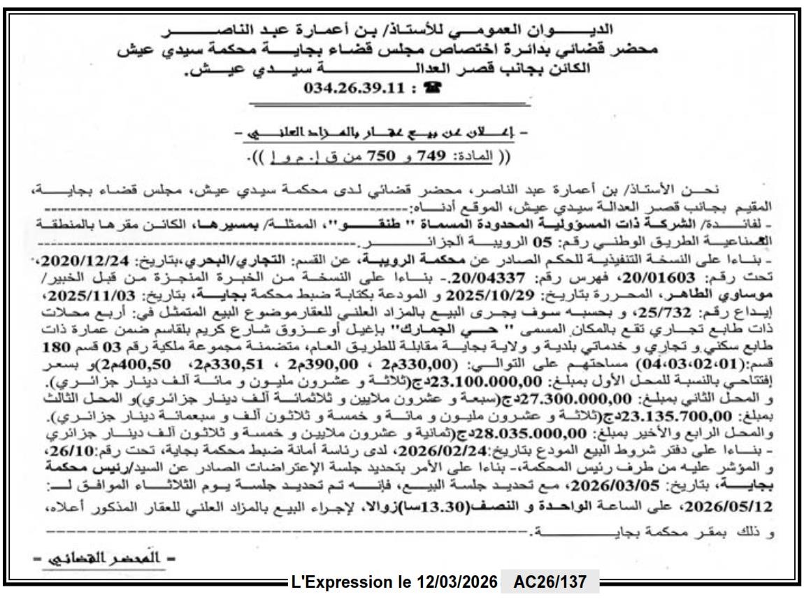 Il sera procédé à la vente au plus offrant et dernier enchérisseur le :