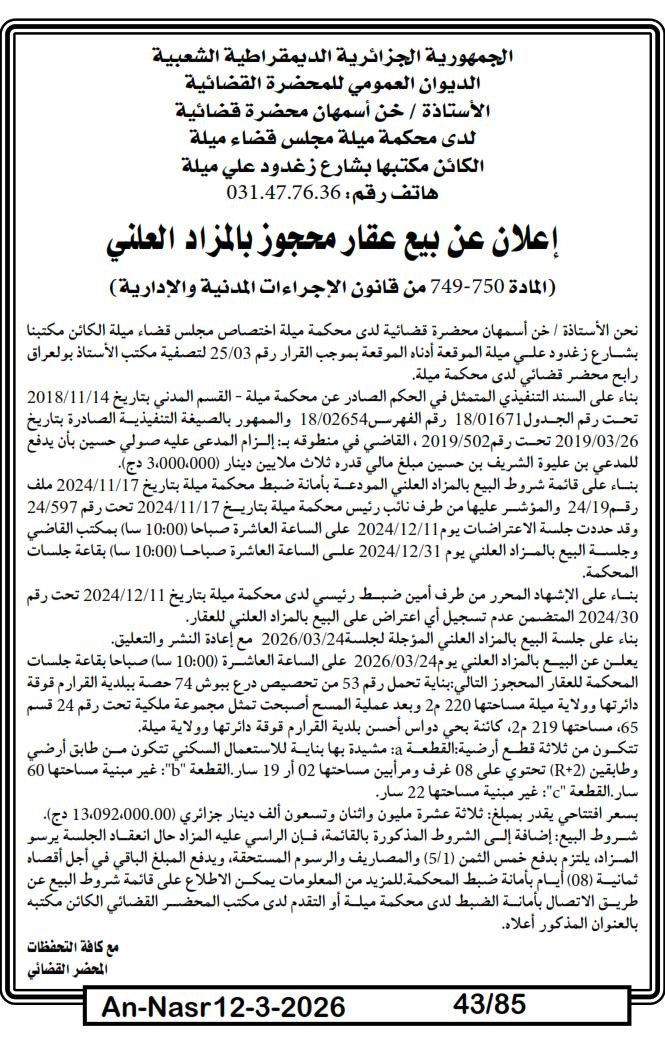 Il sera procédé à la vente au plus offrant et dernier enchérisseur le :
