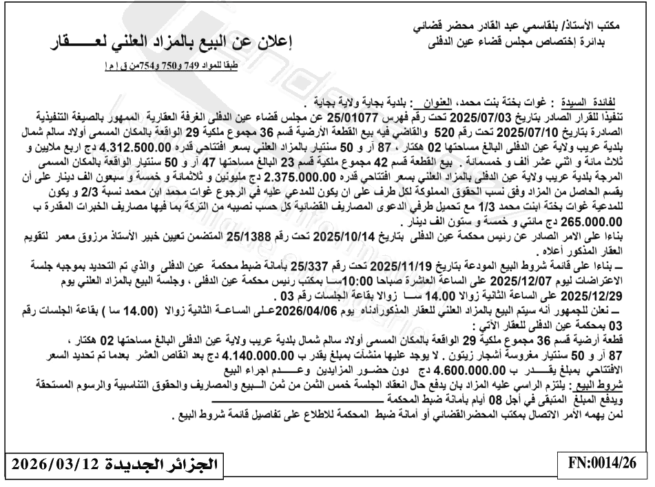 Il sera procédé à la vente au plus offrant et dernier enchérisseur le : 06/04/2026';