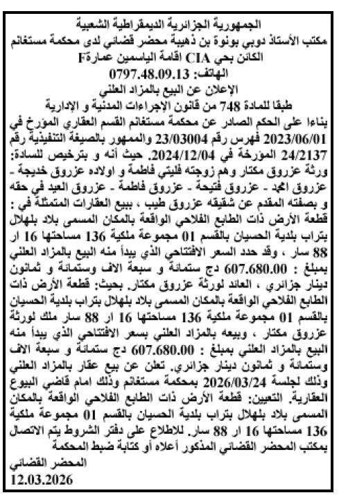 Il sera procédé à la vente au plus offrant et dernier enchérisseur le : 24/03/2026';