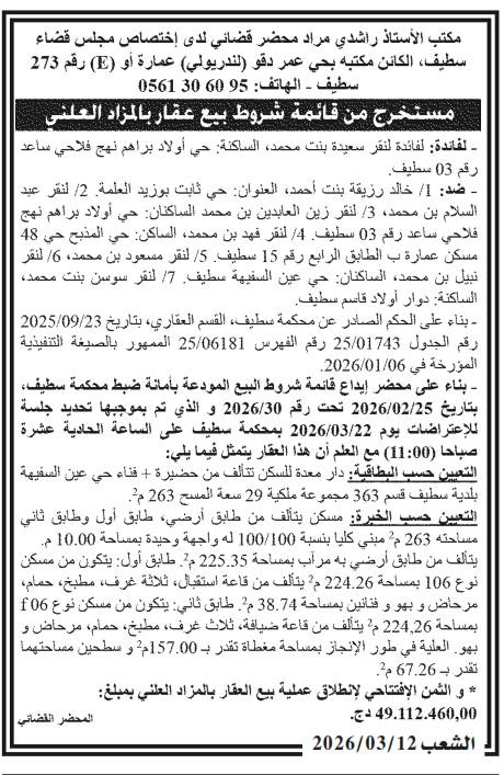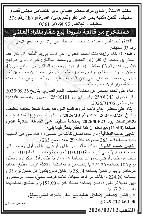 Il sera procédé à la vente au plus offrant et dernier enchérisseur le : 19/03/2026';