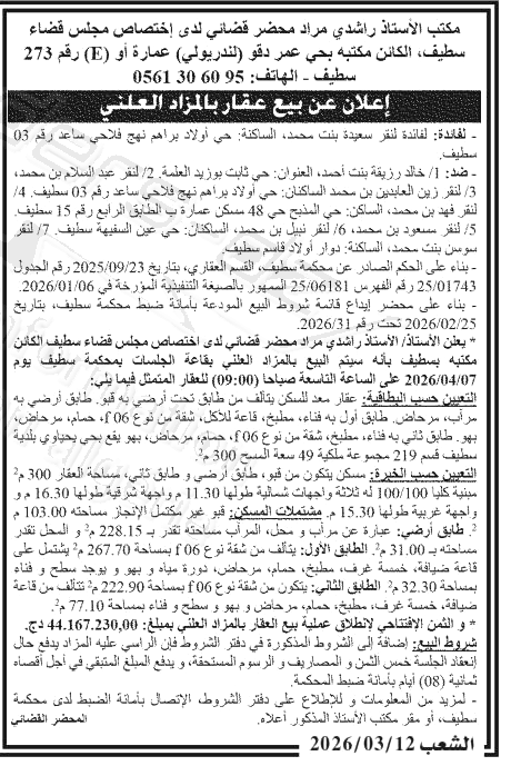 Il sera procédé à la vente au plus offrant et dernier enchérisseur le : 19/03/2026';