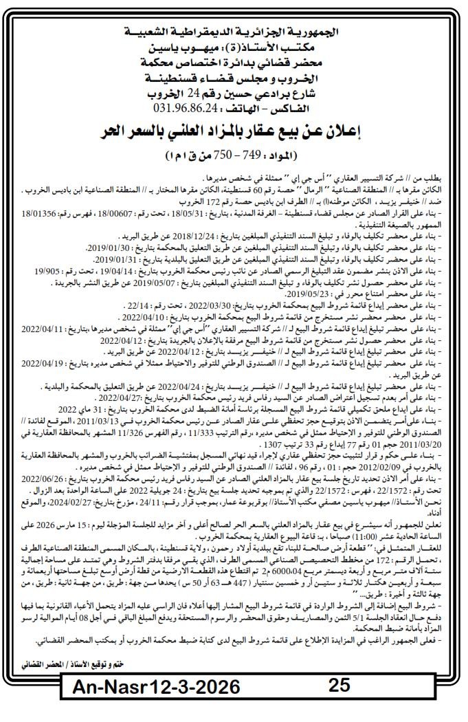 Il sera procédé à la vente au plus offrant et dernier enchérisseur le : 19/03/2026';