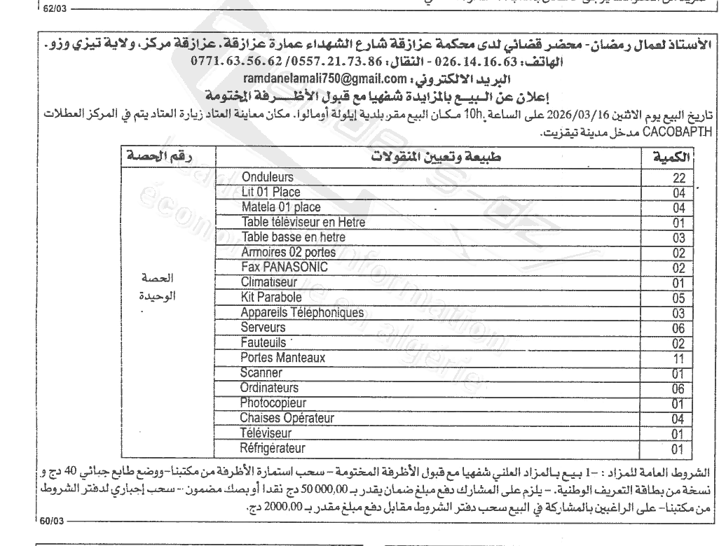 | Objet: Vente des diverts lots | |