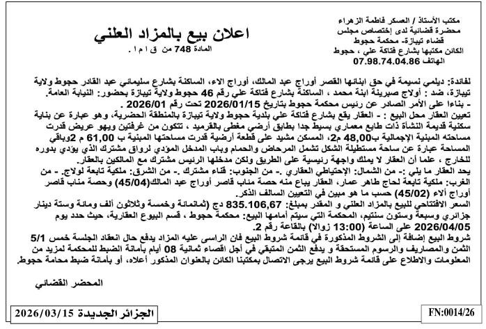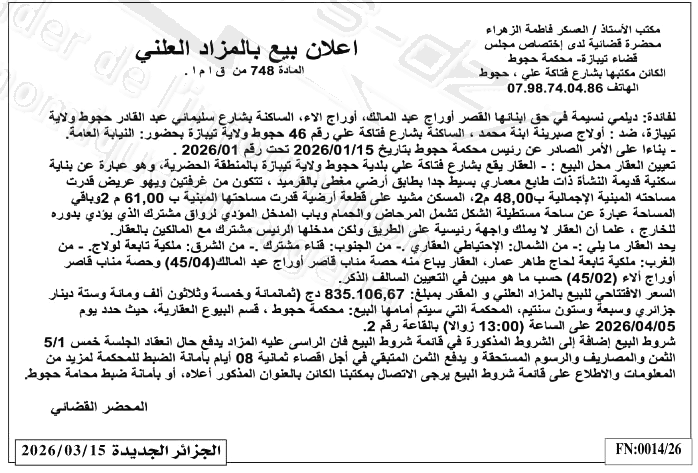 Il sera procédé à la vente au plus offrant et dernier enchérisseur le :
