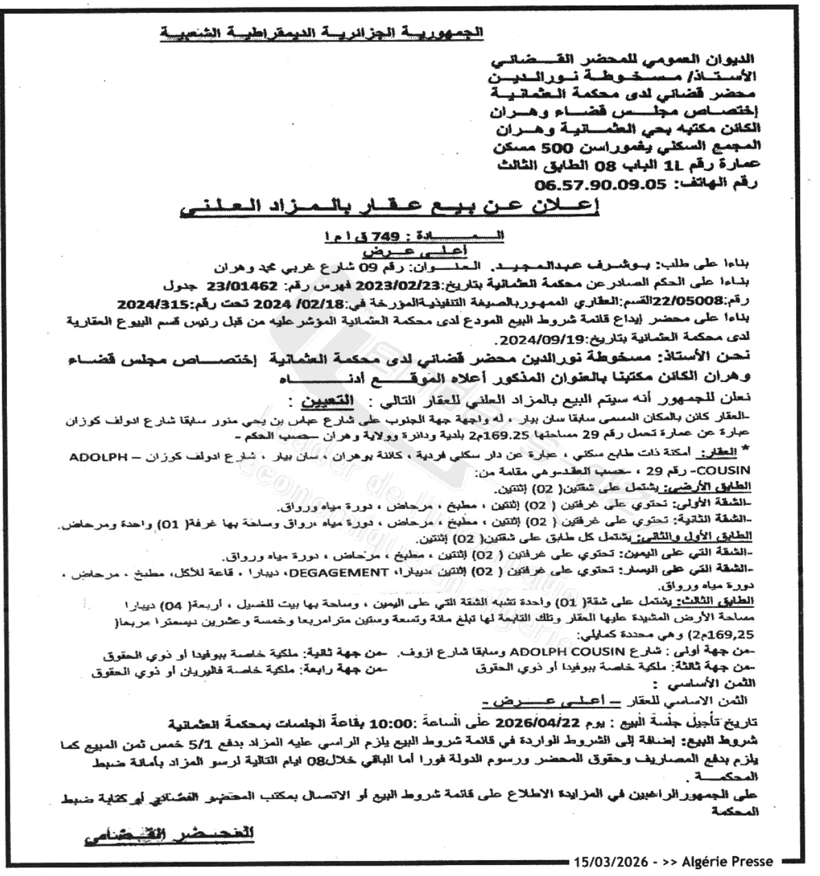 Il sera procédé à la vente au plus offrant et dernier enchérisseur le :