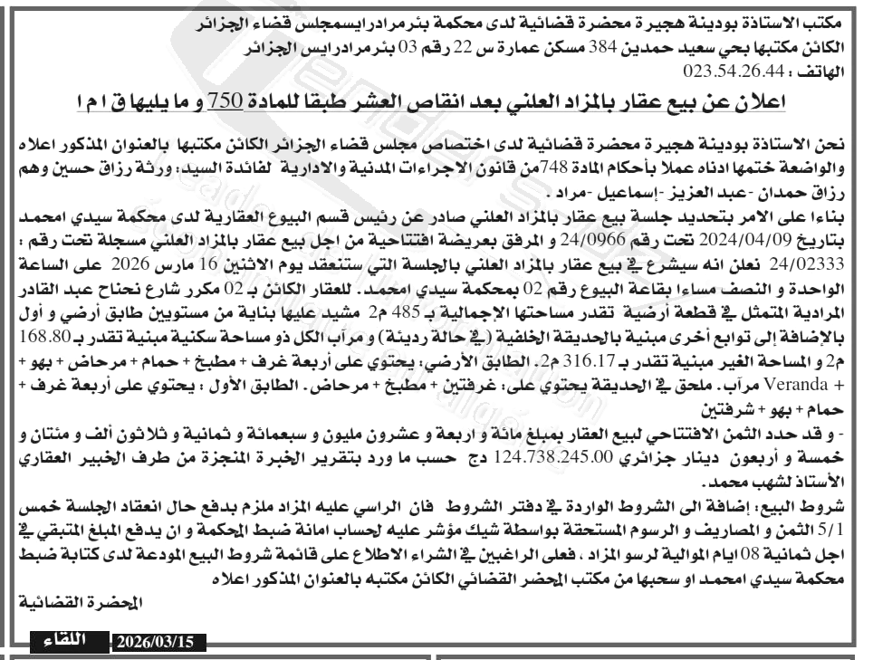 Il sera procédé à la vente au plus offrant et dernier enchérisseur le :