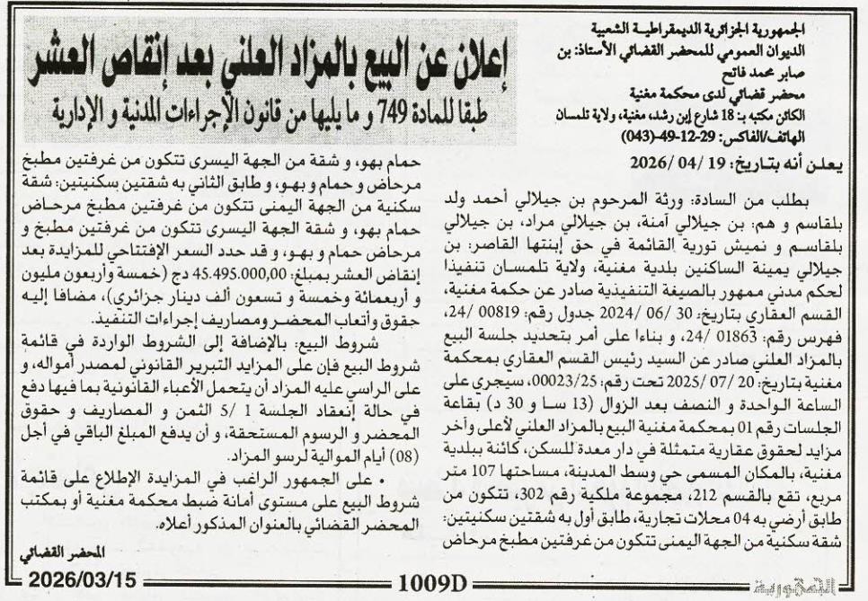 Il sera procédé à la vente au plus offrant et dernier enchérisseur le :