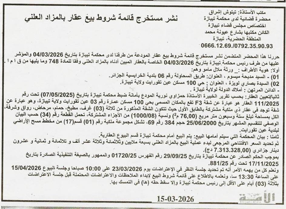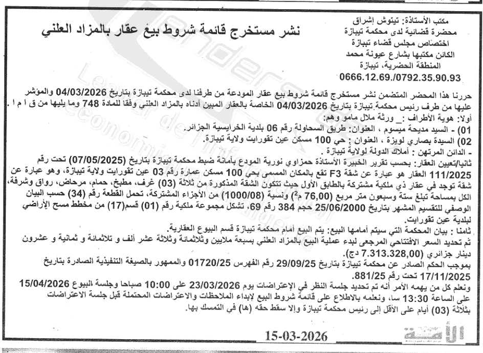Il sera procédé à la vente au plus offrant et dernier enchérisseur le :