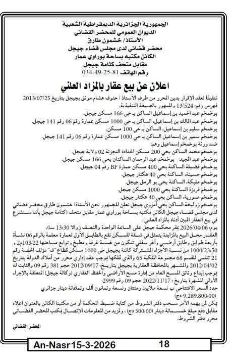 Il sera procédé à la vente au plus offrant et dernier enchérisseur le : 06/04/2026';