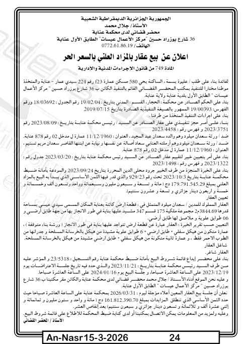 Il sera procédé à la vente au plus offrant et dernier enchérisseur le :