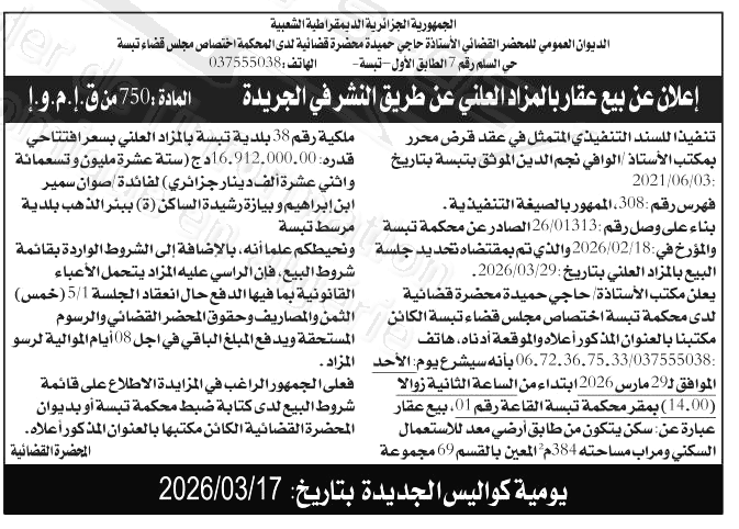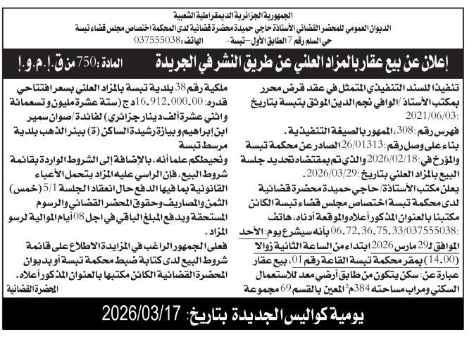 Il sera procédé à la vente au plus offrant et dernier enchérisseur le :